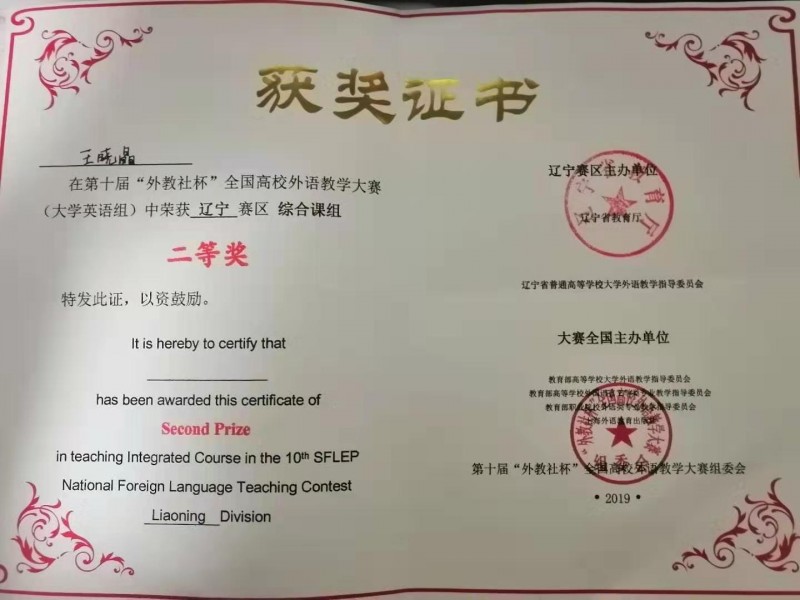外语与通识教研部王晓晶老师在第十届“外教社杯”全国高校外语教学大赛中荣获辽宁赛区综合课组二等奖。